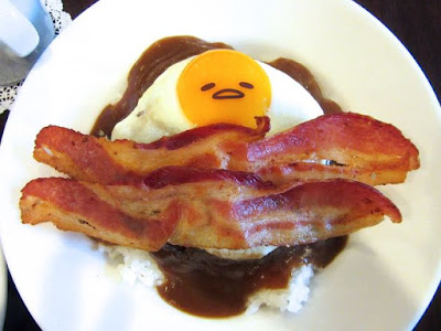 A Gudetama loco moco with bacon blanket is part of a three item Gudetama "Sleepy" menu available at Eggs 'n Things through Oct. 28, 2016. Gudetama's face is created with edible gel paper.